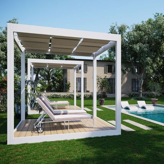 - Une pergola en îlot qui s'intègre sur des sols non lisses (gazon, sable...)