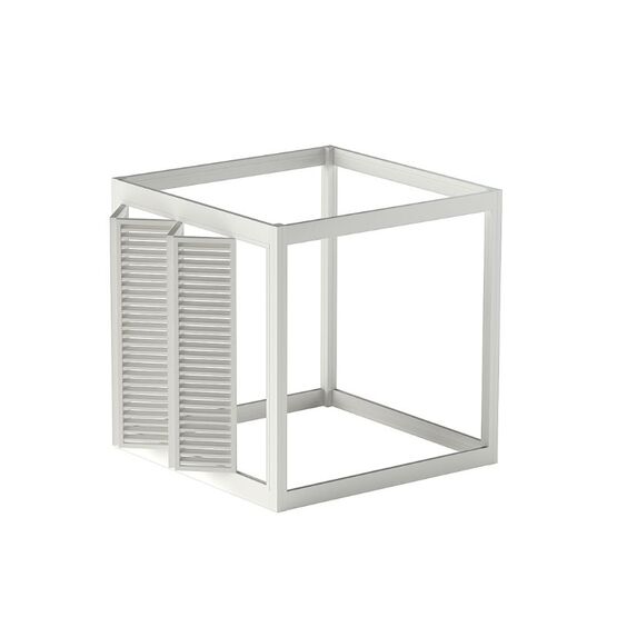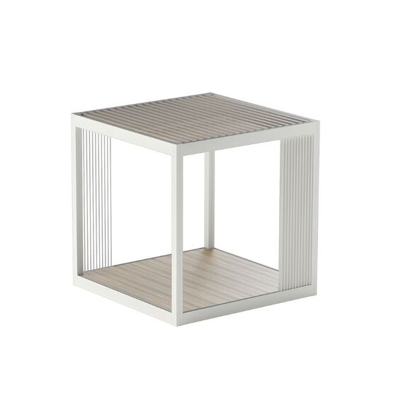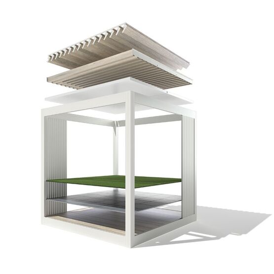 La pergola aluminium ILO est conçue selon différents éléments : une toiture à lames fixes, des persiennes ajourées mais également un traverse basse avec lambourdes pouvant soutenir un plancher.