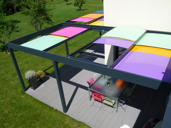 Cette pergola dispose d'une modularité extrême permettant de couvrir la totalité de la surface ou de regrouper tous les panneaux au même endroit. Le maniement manuel est également très aisé grâce à la canne de manœuvre. »