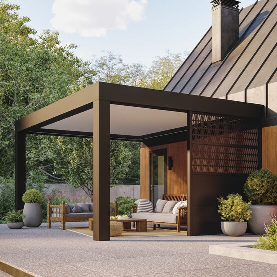 - Fermetures latérales : stores zip, lames ou décors