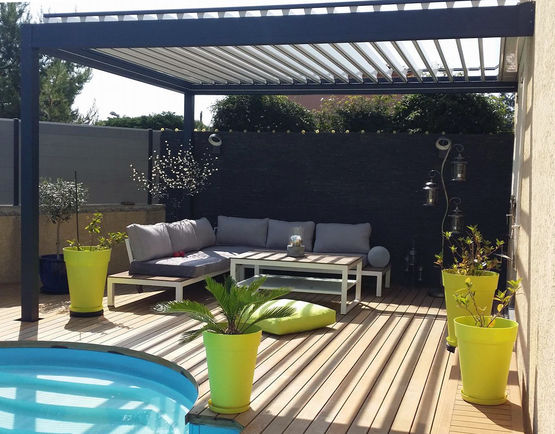 | Options : | - protection solaire de toiture : 5 coloris de toile au choix / stores jusqu'à 6 m sans jonction / 2 motorisations SOMFY au choix / détecteur de vent et pluie - éclairage bandes LEDS basse consommation intégrées aux chevrons |