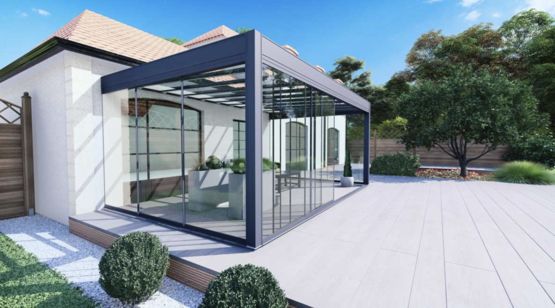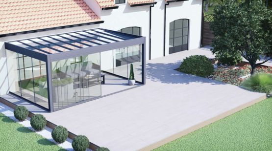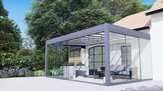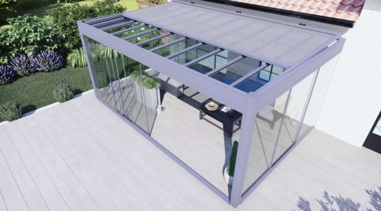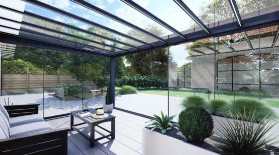 2. Luminosité et protection contre les intempéries : Équipée d'une toiture à simple vitrage feuilleté et de parois vitrées coulissantes en verre trempé, la pergola permet une luminosité maximale tout en assurant une barrière efficace contre vent et pluie, grâce à son système d'évacuation d'eau pluviale invisible.