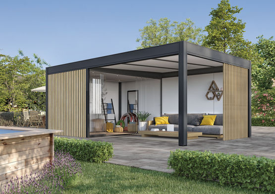 Cette pergola bioclimatique offre une solution d’extérieur innovante pour se protéger du soleil, pluie et vent grâce à son toit fermé qui assure une protection totale contre les rayons UV et les intempéries.