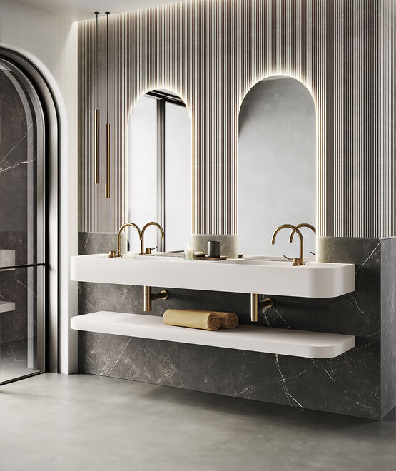2. Installation polyvalente : Adapté à une installation autoportante directement au mur ou sur un meuble de la gamme Arum, il s'adapte à diverses configurations d'espace.