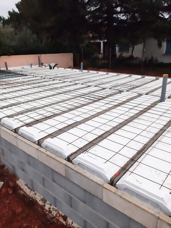 - Système de plancher sur vide sanitaire composé de poutrelles LS sans étais, d’Entrevous isolants, de rupteurs de ponts thermiques et d’une dalle de compression armée coulée sur chantier.