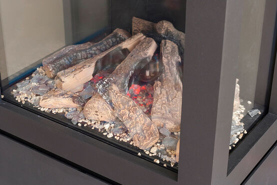Le lit de braises est illuminé par le module LED Symbio qui recrée un effet de rougeoiement subtil et indépendant de la chaleur.