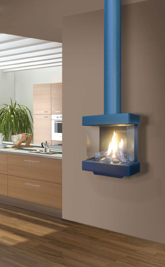 Ses 3 faces vitrées offrent une vue panoramique sur la flamme (481 × 388 mm), créant une ambiance chaleureuse et raffinée.