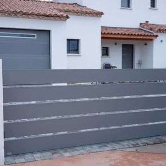 Proposé en finition alu Access et Premium, cet portail est doté d'une traverse centrale horizontale droite, d'un barreaudage horizontal ou vertical avec une brise vue et d'un remplissage horizontal ou vertical. L'usager peut opter pour une ouverture battante ou coulissante aspect avec 1 ou 2 vantails.