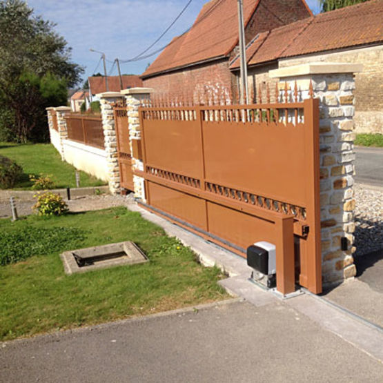 Gamme de portails aluminium battants ou coulissants, à un ou deux vantaux. Structure à montage par assemblage mécanique permettant une bonne résistance aux intempéries et aux variations de température. Muni d'une traverse de 4 mm d’épaisseur pour une rigidité accrue et une grande longueur. Remplissage par barreaudage en profilés aluminium extrudé personnalisables, panneaux en tôle métallique à découpe laser ou vitrage sérigraphié. Application possible de tout type d’automatisme en applique ou encastré. Manoeuvre manuelle ou motorisée.