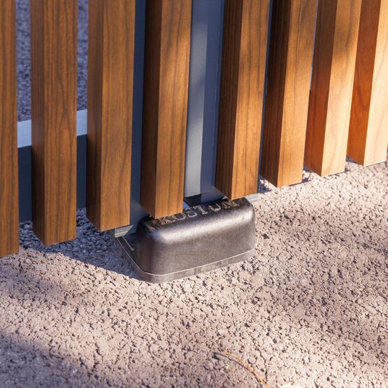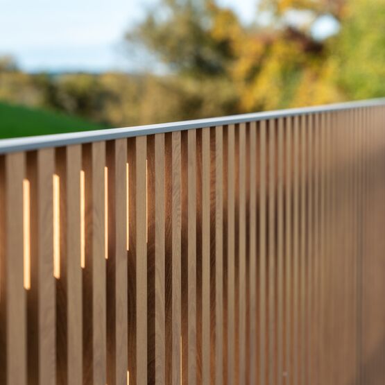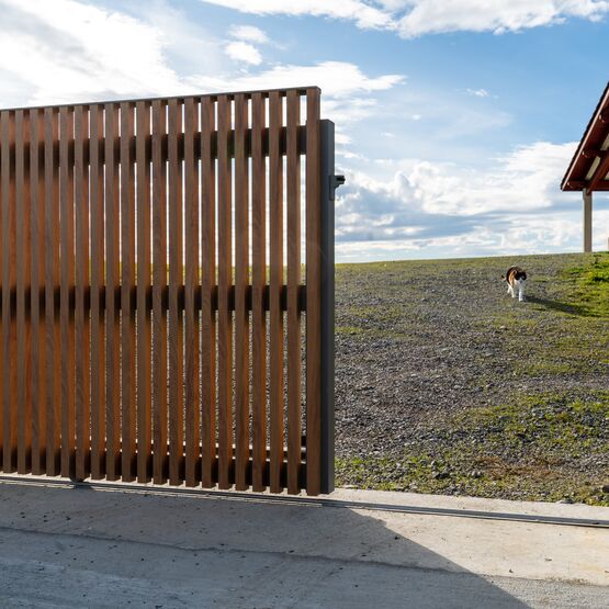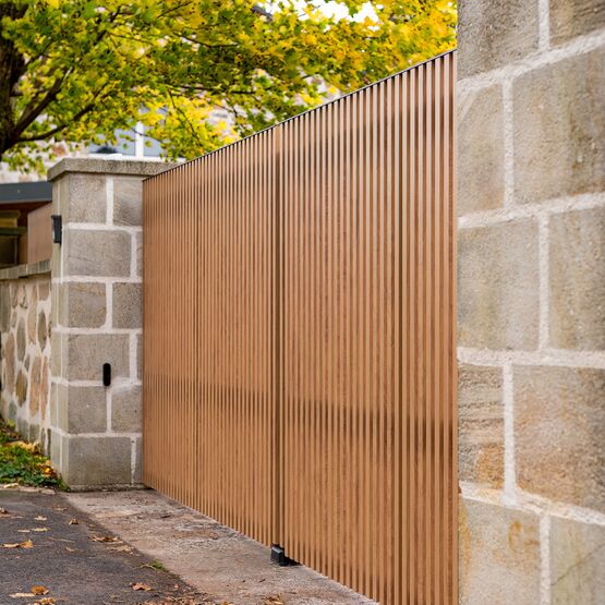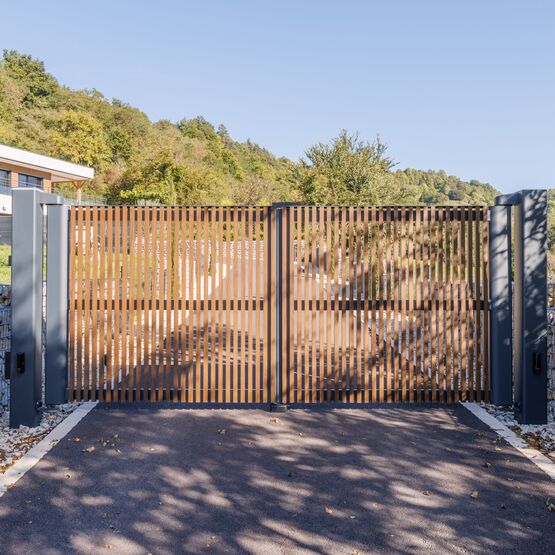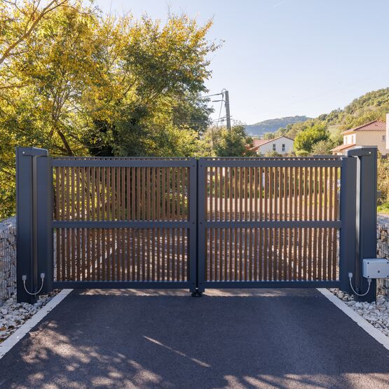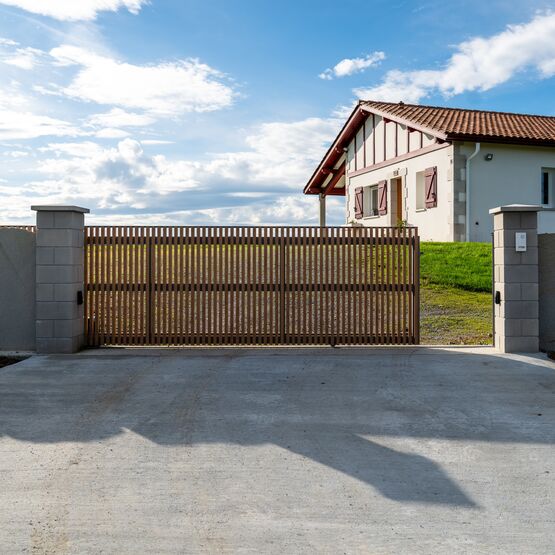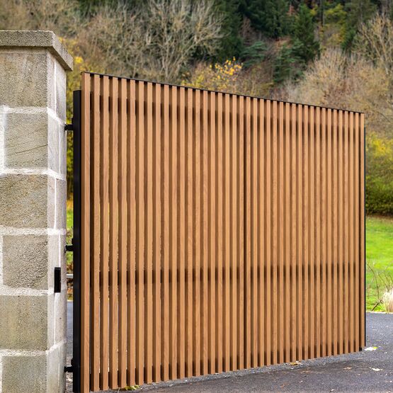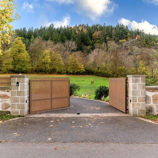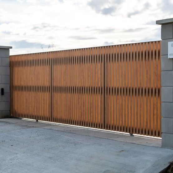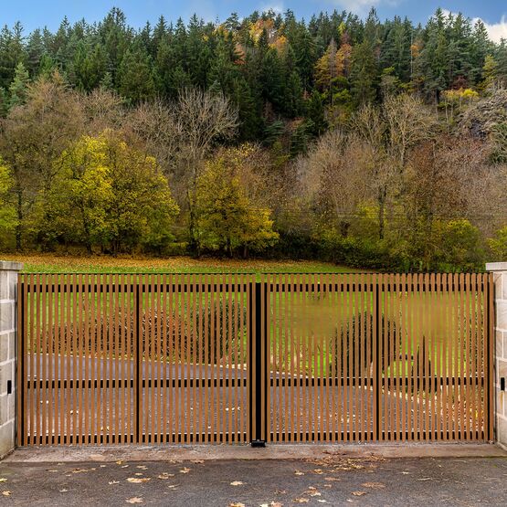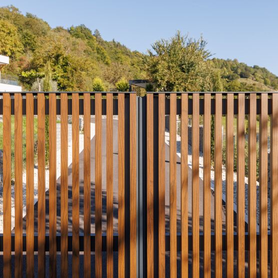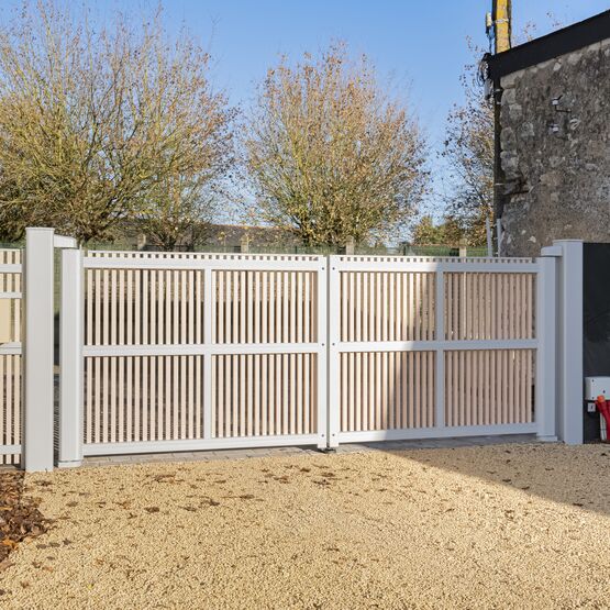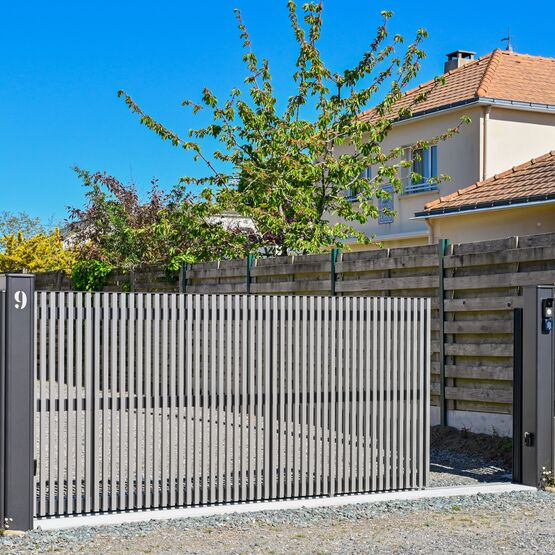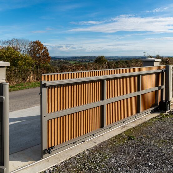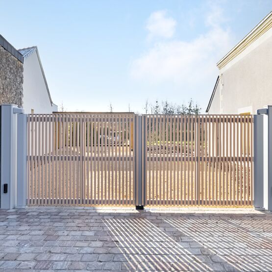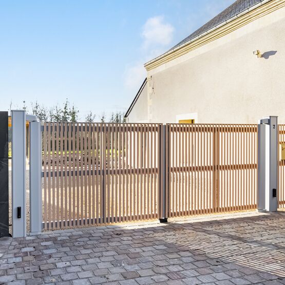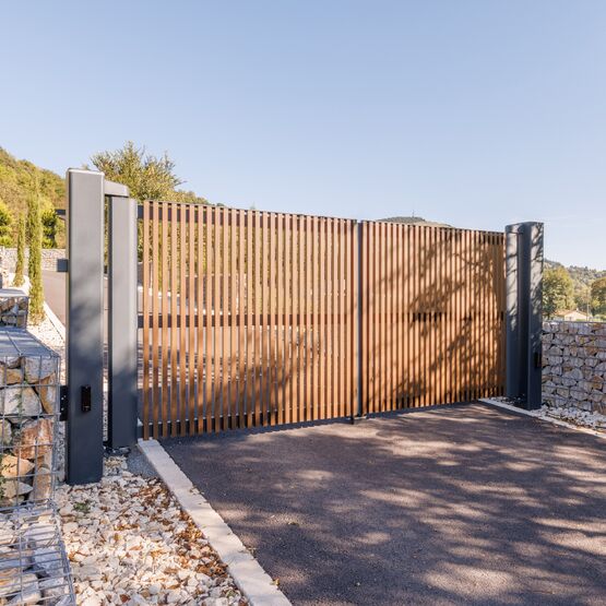 Ce modèle en aluminium se décline avec des tons bois qui marient élégance et modernité, pour un portail ajouré autant robuste que raffiné.