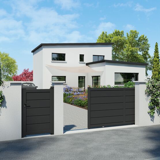 Ce portail en aluminium au design contemporain, disponible en version battante ou coulissante, s’adapte parfaitement à votre propriété. Il peut être assorti à une clôture et à un portillon pour créer une entrée élégante et harmonieuse, idéale pour une maison individuelle ou une résidence.