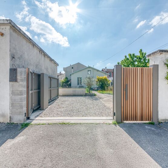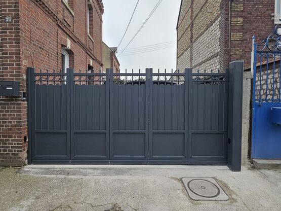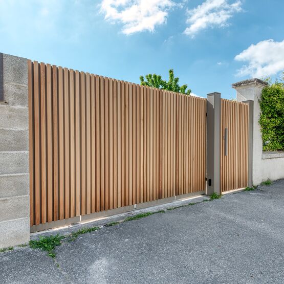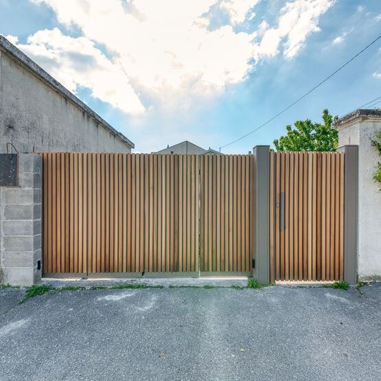 Ce portail aluminium durable et sans entretien est disponible en plusieurs designs : habillé de tôles verticales, avec des tasseaux en couleur ou coloris ton bois ou en style fer forgé.