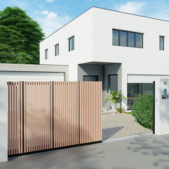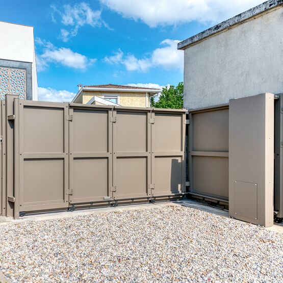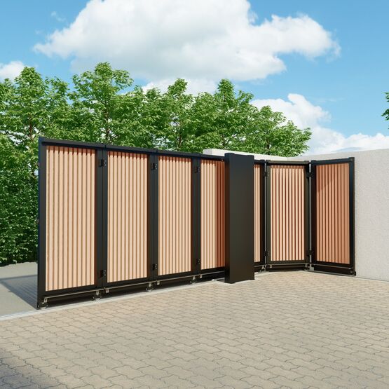 Son ouverture spéciale lui permet de coulisser le long d’un mur en angle, sans nécessiter un grand espace de refoulement comme un portail battant ou coulissant classique. Selon la taille de votre entrée, vous pouvez choisir entre deux modèles et un angle de refoulement ajustable jusqu’à 90°.