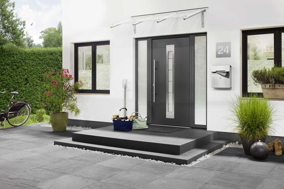 Porte à panneau en acier galvanisé pour entrées principales et secondaires. Remplissage par mousse rigide polyuréthane sans CFC de 46 mm d'épaisseur. Cadre d'ouvrant caché, doté de joints doubles sur quatre côtés et d'un joint à brosse en zone inférieure, améliorant l'étanchéité air/eau/vent. Verrouillage 5 points en modèle standard. Intégration possible d'un double ou triple vitrage feuilleté, rectangulaire, arrondi ou en 4 parties, affleurant à l'extérieur et à l'intérieur. Equipée de poignées en différents modèles. Huisserie en aluminium à rupture de pont thermique d'une épaisseur de 60 mm. Variante d'huisserie avec profil arrondi ou rectangulaire. Disponible en nombreux décors contemporains ou à cassettes et en 16 couleurs préférentielles, 9 finitions sablées, 5 décors bois ou anthracite.
