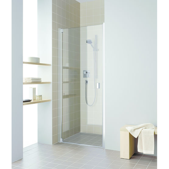 Porte de douche pivotante en verre de sécurité clair de 6 mm d’épaisseur. Équipée de profilés muraux en aluminium intégrant un système d’ajustage de 10 mm. Ouverture vers l’intérieur et l’extérieur assurée par des charnières spécifiques avec système de réglage des faux aplombs sur 20 mm. Mécanisme de relevage à l’ouverture. Livrée avec baguette d’étanchéité. Proposée avec paroi fixe, porte deux vantaux, accès d’angle, paroi arrondie, grandes largeurs etc.