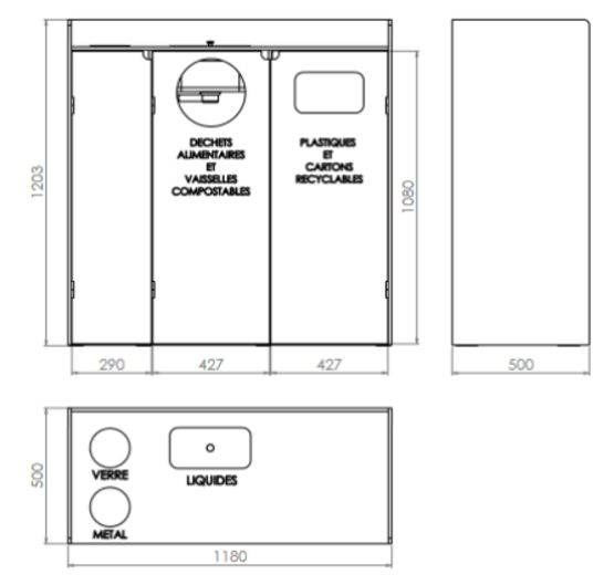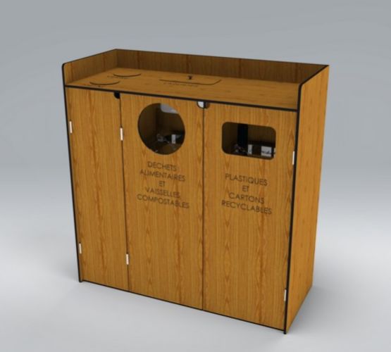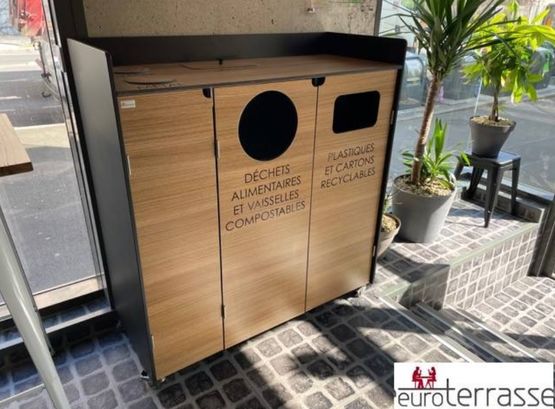 Cette poubelle professionnelle de tri sélectif pour restaurant et snack est composée d'une structure en tube métallique (traitement catégorie C4 selon la norme ISO 12944 - 2) et de stratifié compact HPL plein (coloris au choix).