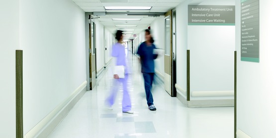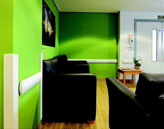 Le revêtement anti-rayures en Acrovyn enrobe un profilé ultra-robuste en aluminium filant qui lors des chocs absorbe l’impact par translation pour préserver le mur de l'onde de choc et le matériel à l'origine du choc.