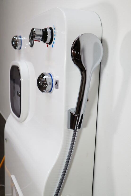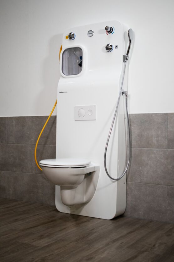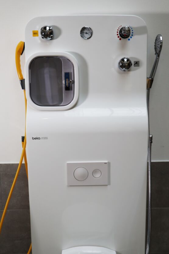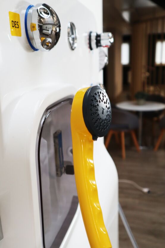De dimensions de 650 x 180 x 65 mm, cet appareil sanitaire PMR est composé d'un compartiment verrouillable avec réservoir de désinfectant, une vanne de désinfection, un thermomètre pour la température de l’eau des douchettes et une vanne des douchettes à main. Une douchette désinfectante jaune (à gauche) et une douchette hygiénique blanche (à droite) sont également installées. Un WC intégré est proposé en option.