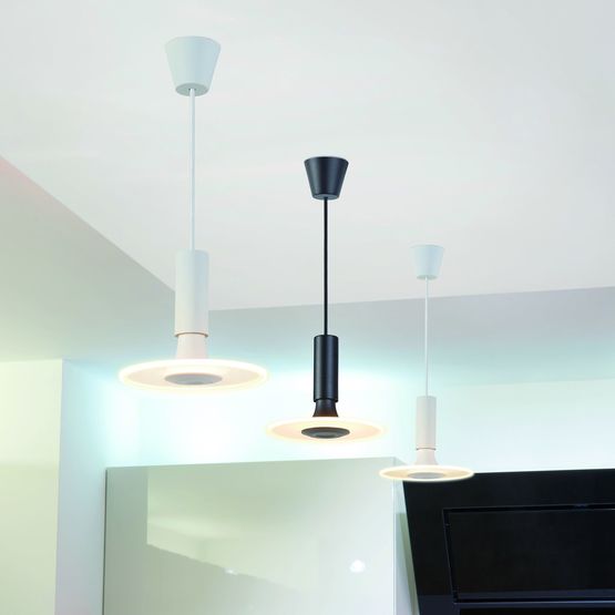 | Accessoires : | fixation par éclisse externe (suspension) ou interne (plafonnier), embout, suspension par chaînette réglable ou non, bras d'articulation pour montage en angle. |