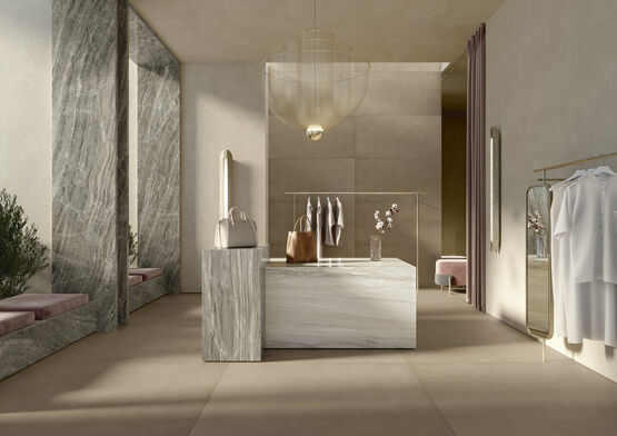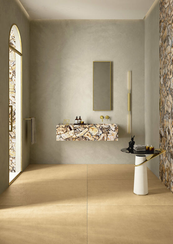 Inspirées par les principes de la chromothérapie, les nouvelles surfaces offrent des nuances douces et polyvalentes qui acquièrent une valeur esthétique supplémentaire lorsqu'elles sont combinées aux qualités visuelles et tactiles du marbre Fiandre, de la pierre, de l'agate et du granit céramique.