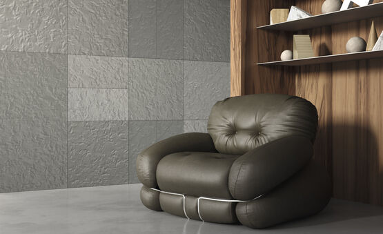 Associé à un relief discret, cet effet confère à la céramique un aspect vivant et changeant, particulièrement sous l’effet de la lumière, qu’elle soit naturelle ou artificielle. Il révèle ainsi toute la richesse des textures de Tribute 100.