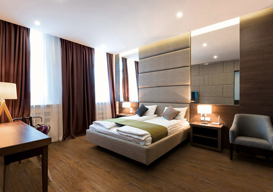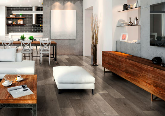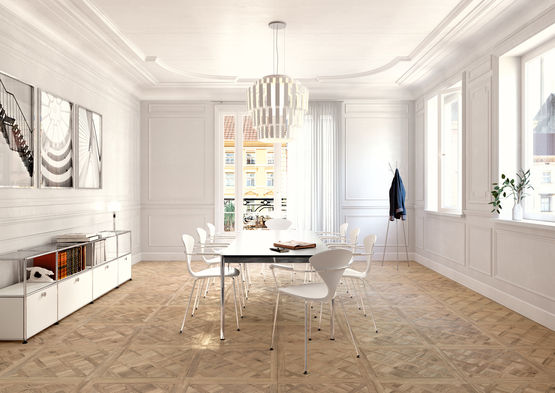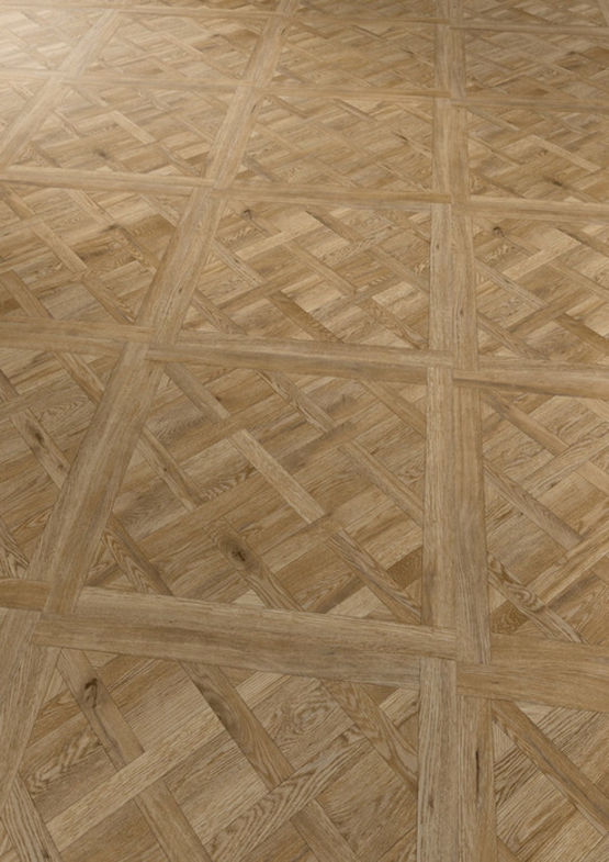 Les décors en bois, qui mettent tout simplement en valeur un savoir-faire ancestral, constituent une particularité : les dalles Versailles à l’aspect tressé ou des lames de parquet plus courtes garantissent des poses à bâtons rompus remarquables.