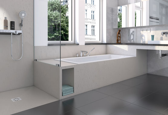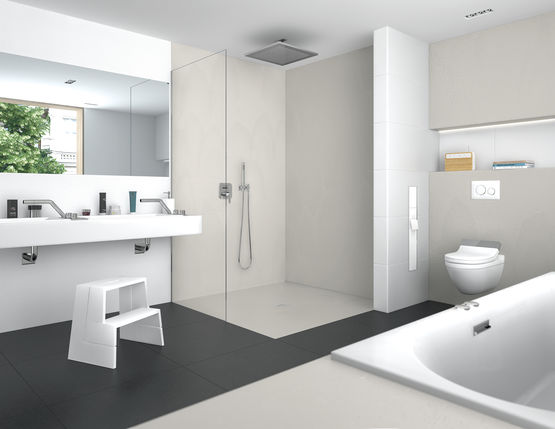 Les revêtements Fundu Top, spécialement conçu pour les receveurs de douche wedi Fundo permettent, grâce à leur faible hauteur de construction, de créer un vaste espace douche de plain pied.
