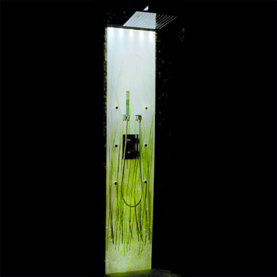 - Équipé d'un mitigeur thermostatique rectangulaire (Select 300) avec tablette de 30 cm de largeur servant de support