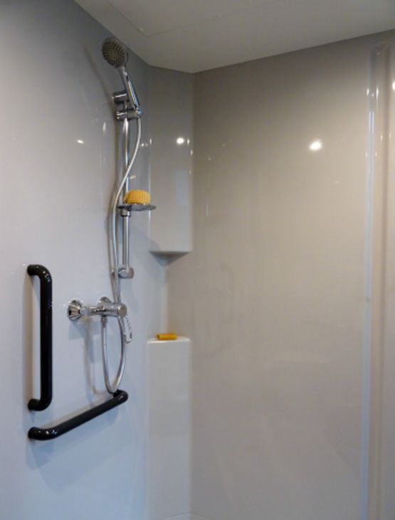 L’espace douche intègre une douche, un ensemble barre de douche réglable intégrant flexible, pomme et porte-savon, un mitigeur douche, un rideau de douche monté sur rail en aluminium, un espace de rangement et 2 barres de maintien droites et fixes.