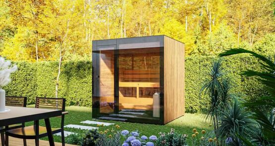 Cette cabine de relaxation compacte s’intègre parfaitement à l’espace extérieur tout en préservant l’intimité. Elle mesure 227x 208 x 230 cm (L x l x H) et son four offre une puissance de 9 kW.