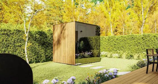 Sauna extérieur avec grande façade vitrée effet miroir | Pure