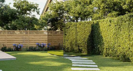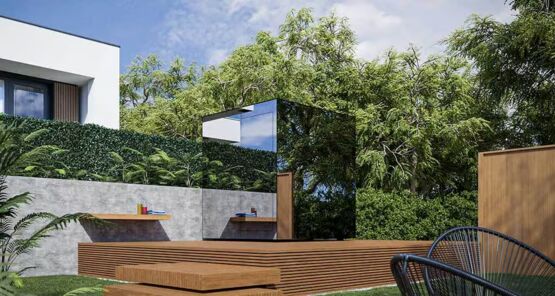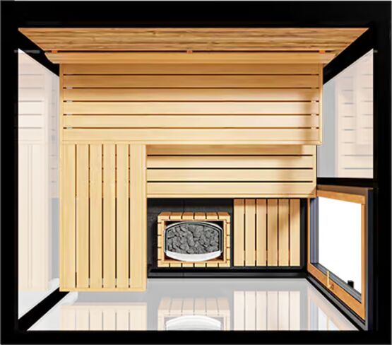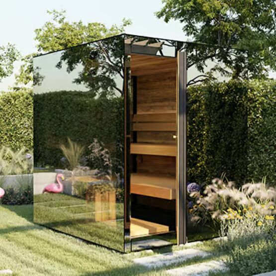 Grâce à ses trois parois vitrées, ce bain de vapeur permet de profiter d’une vue à 180° sur le jardin. Le verre miroir réfléchit la végétation environnante afin d'assurer une intégration parfaite du sauna dans son environnement, tout en empêchant les regards extérieurs.