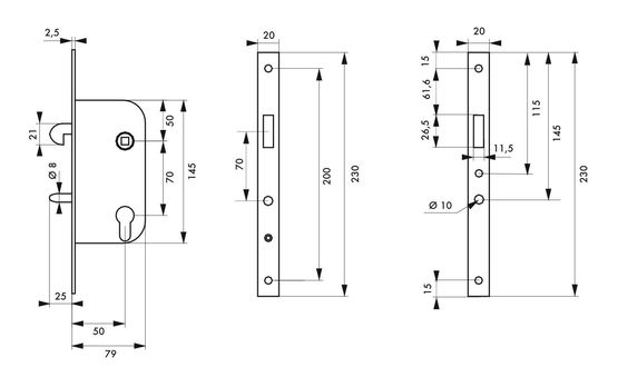| Matériaux : | acier - coffre, têtère, gâche plate ; laiton - pêne crochet |