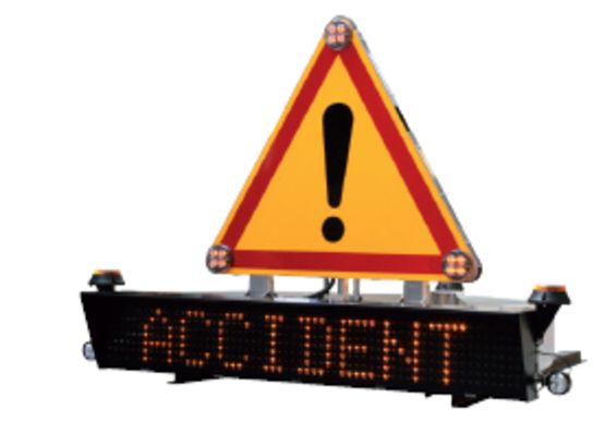 Ces équipements d’éclairage sont composés d’un triangle AK14 simple face de 1250 mm avec un film classe 2 et équipé de 3 lampes à LEDs optiques de diamètre 210 mm, 2 gyrophares à LEDs orange et un panneau à messages variables de 8 ou 10 cartes jusqu’à 12 caractères de HC 200 mm ou de 9 cartes jusqu’à 11 caractères HC 250 mm.