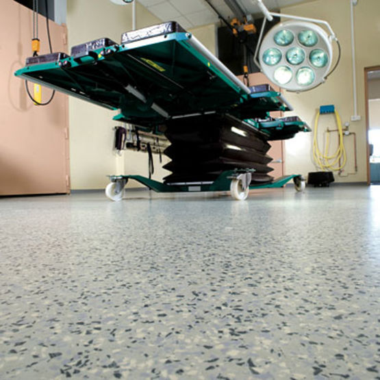 Le revêtement de sol coulé sans joint pour trafic intense TERRAZOFLEX type C est réalisé en résine polyuréthane et granulés de caoutchouc. Il dispose d'un aspect lisse et homogène.
