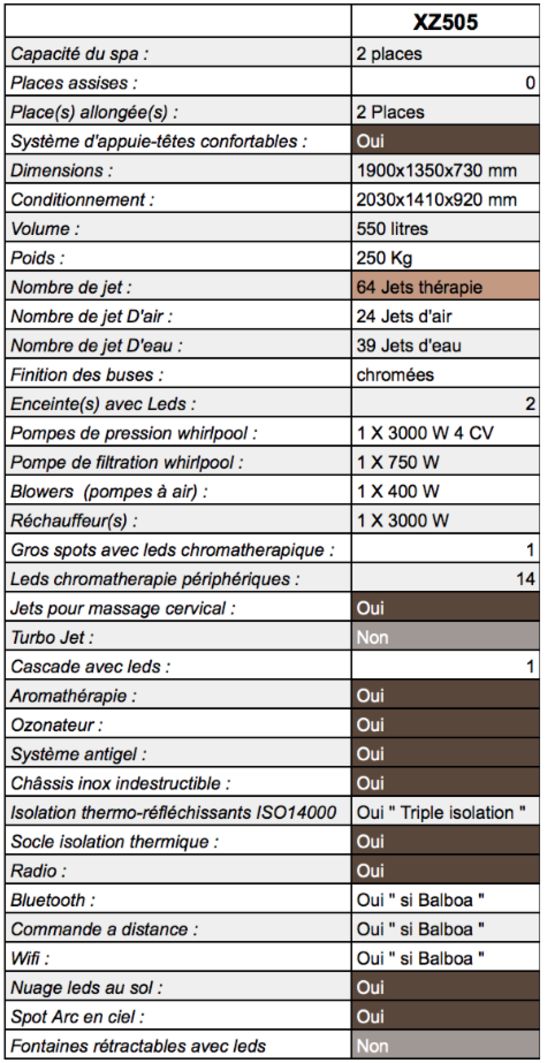 Le spa XZ505 est caractérisé par sa coque robuste et durable en acrylique ainsi que son châssis en Inox. Il est équipé de 2 pompes à eau et une pompe à air avec 64 jets dont 24 émettent des jets d’air, le reste fournit des jets d’eau.