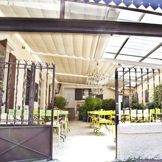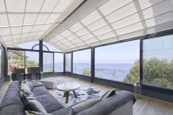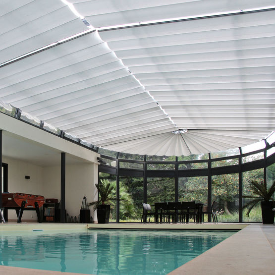 Destiné aux vérandas en aluminium équipées d'une toiture tubulaire ou en épine, ce store velum sur rails assure à la fois protection solaire et isolation thermique des surfaces vitrées, inclinées ou horizontales.