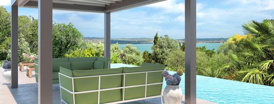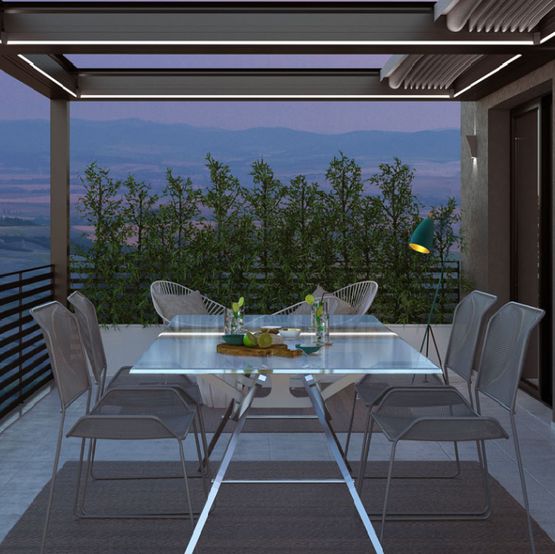 | Options : | Kit éclairage blanc à led d’intensité variable sur périmètre interne Kit éclairage RGB à led dimmable sur périmètre externe Store à enroulement latéral Vertika Prime intégré jusqu’à 6 mètres et entièrement caché dans le périmètre Store drapé sur périmètre interne Fenêtres coulissantes panoramiques |