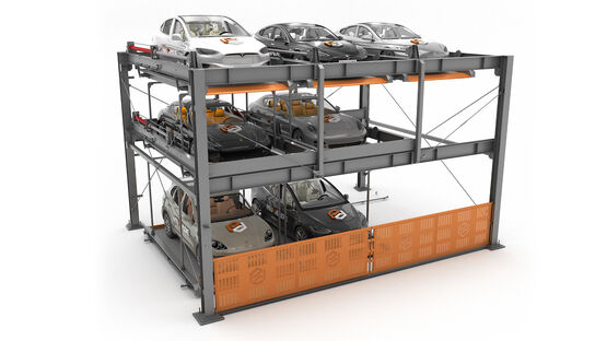 Ce système de parking dispose de sas de transfert qui peuvent être agencés de manière flexible, et le temps de récupération des véhicules est optimisé grâce à un système d'échange rapide de palettes.