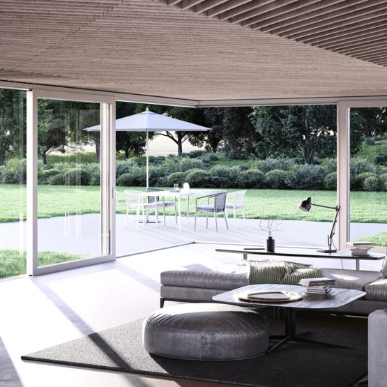 La nouvelle génération de portes coulissantes à levage heroal combine un ouvrant monorail mobile et un vitrage de dormant fixe se caractérisant par des largeurs visibles minimales.