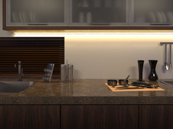 Les profilés encastrés POLARUS et POLARUS MICRO sont particulièrement conçus pour s'intégrer dans une rainure fraisée du meuble ainsi qu'aux projets au design minimaliste. Ils offrent une surface de meuble lisse et épurée et une ligne lumineuse intégrée sans boîtier apparent, tout en garantissant un éclairage homogène et harmonieux.