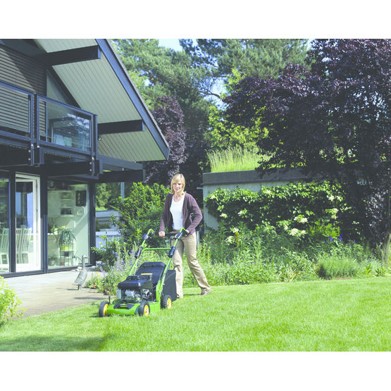 Tondeuse autoportée sur châssis à large empattement destinée aux terrains de moins de 0,9 ha de surface. Grande amplitude de réglage des coupes en douze positions. Equipée d’un moteur bicylindre à soupapes en tête et transmission hydrostatique. Train avant en fonte avec double pare-choc. Roues à roulement dotées d’une direction à double tringlerie et de pneumatiques larges. Rayon de braquage de 40 cm améliorant la maniabilité. Régulateur de vitesse et dispositif de tonte en marche arrière. Bac de ramassage de 400 litres de contenance avec indicateur sonore de remplissage et relevage électrique inclus. Mulching en option.