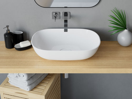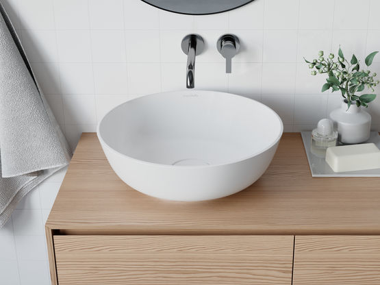 Réalisée en composite moulé à base de résine et pierre naturelle (Dolotek), les vasques VARS offrent une surface durable antibactérienne à l'entretien facile et au toucher soyeux.