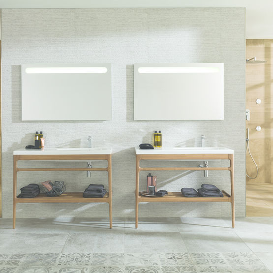 - Structure: Frêne avec porte serviette intégré et tablette