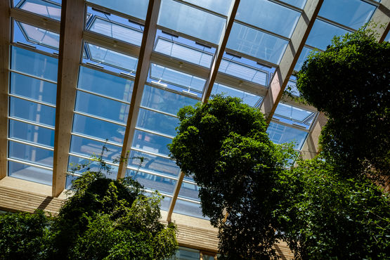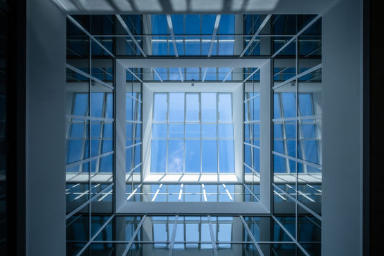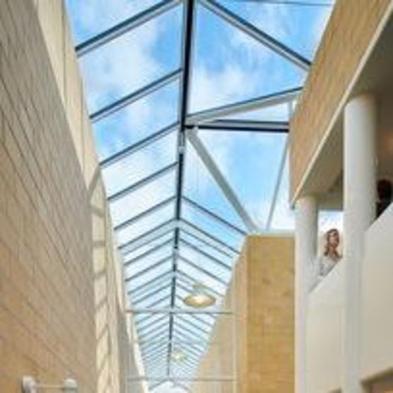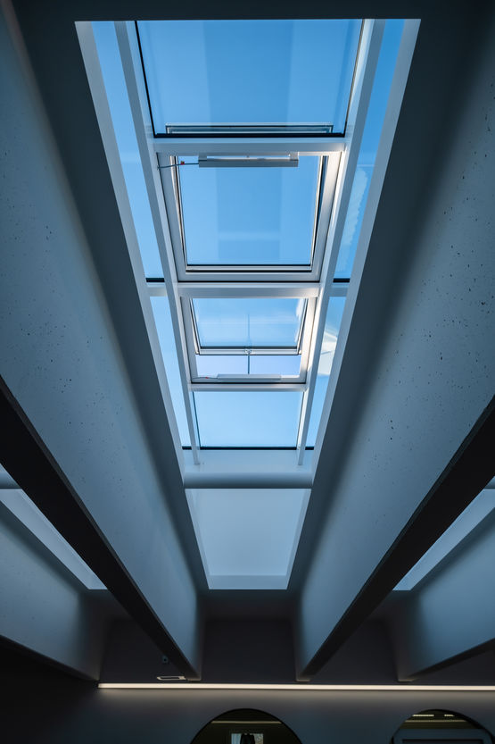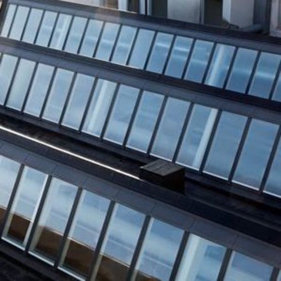Verrière de toiture hautes performances thermiques et acoustiques, à structure porteuse en aluminium modulable pour tout type de toiture, plat, courbe ou oblique. Structure primaire et secondaire sur mesure en profilés minces à noyau isolant, utilisés comme montants, traverses, chevrons ou pannes, offrant une résistance mécanique élevée, y compris au niveau des jointures porteuses. Enserre un double ou triple vitrage spécifique (PR60) bords chauds avec assise élastique. Dotée d’une étanchéité optimisée en EPDM permettant une ventilation de la feuillure du verre et un drainage contrôlé de l’eau et du condensat. Intégration possible de vantaux avec clapets automatisés pour ventilation naturelle et évacuation des fumées (DENFC). Adaptée aux bâtiments passifs.