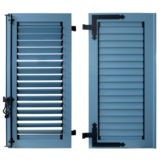 Ces volets en aluminium sont fournis avec espagnolette composite (Mistral), espagnolette tout aluminium (Thémis, Symeth et Océanos), ferrage aluminium noir, gonds à sceller composite, arrêts marseillais à visser avec butée composite, butée haute et basse PVC (Mistral), butée aluminium (Thémis, Symeth et Océanos).
